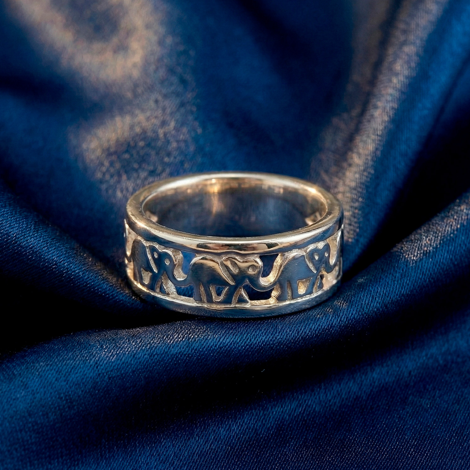 Anillo enchapado en plata 925 con diseño calado de elefantes. Una joya simbólica de buena suerte con acabado brillante, ideal para añadir un toque personal a tu estilo.
