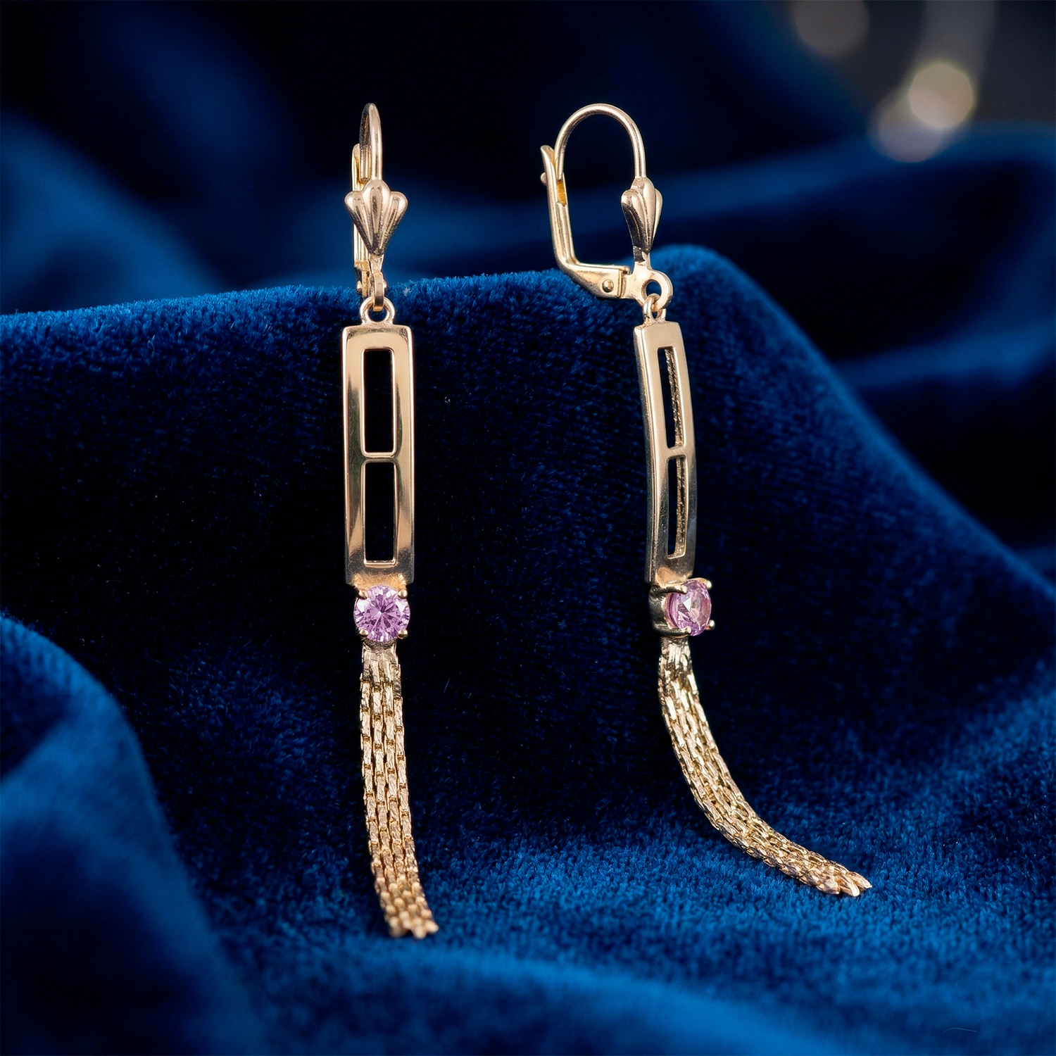 Aretes largos enchapados en oro con marco rectangular calado, cristal rosa y triple caída de cadenas de malla. Una joya de estética minimalista, gran movimiento y un brillo excepcional.