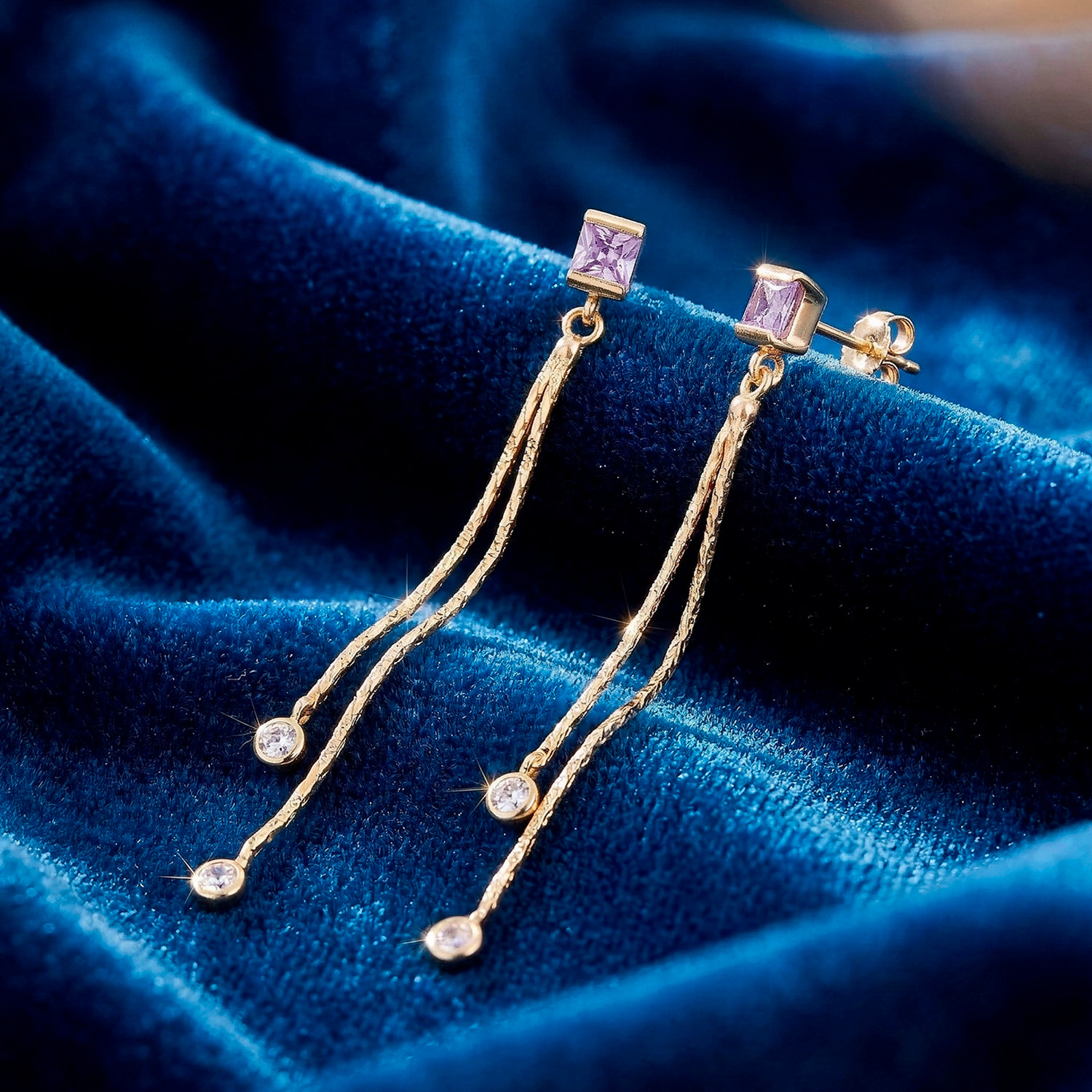 Aretes largos enchapados en oro con cristal cuadrado color amatista y doble caída de cadenas con detalles de cristales brillantes. Una joya ligera, moderna y con un movimiento encantador.