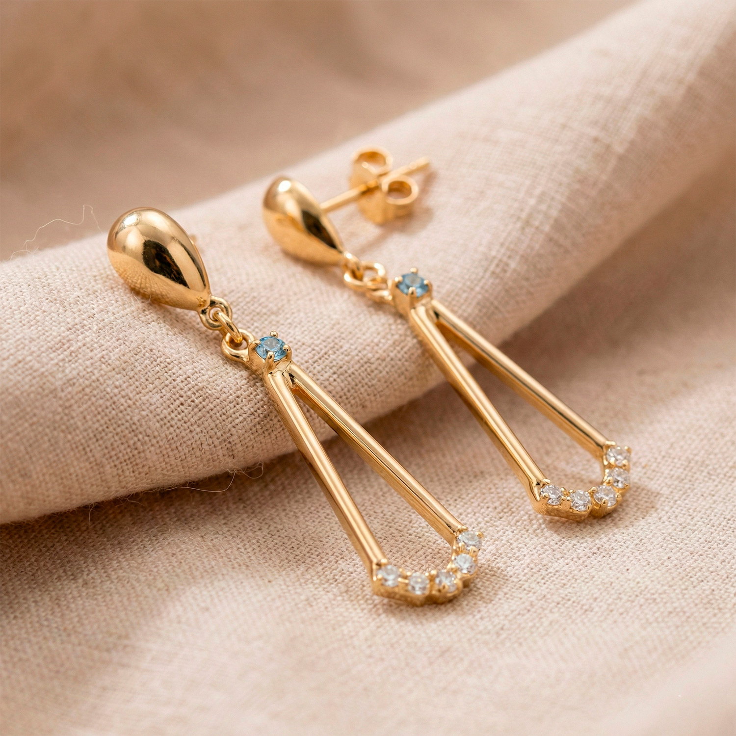 Aretes largos enchapados en oro con diseño triangular, cristal azul y detalles de circonias. Una joya vanguardista, ligera y sofisticada.