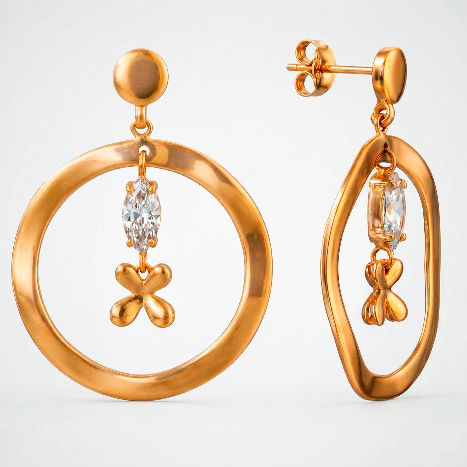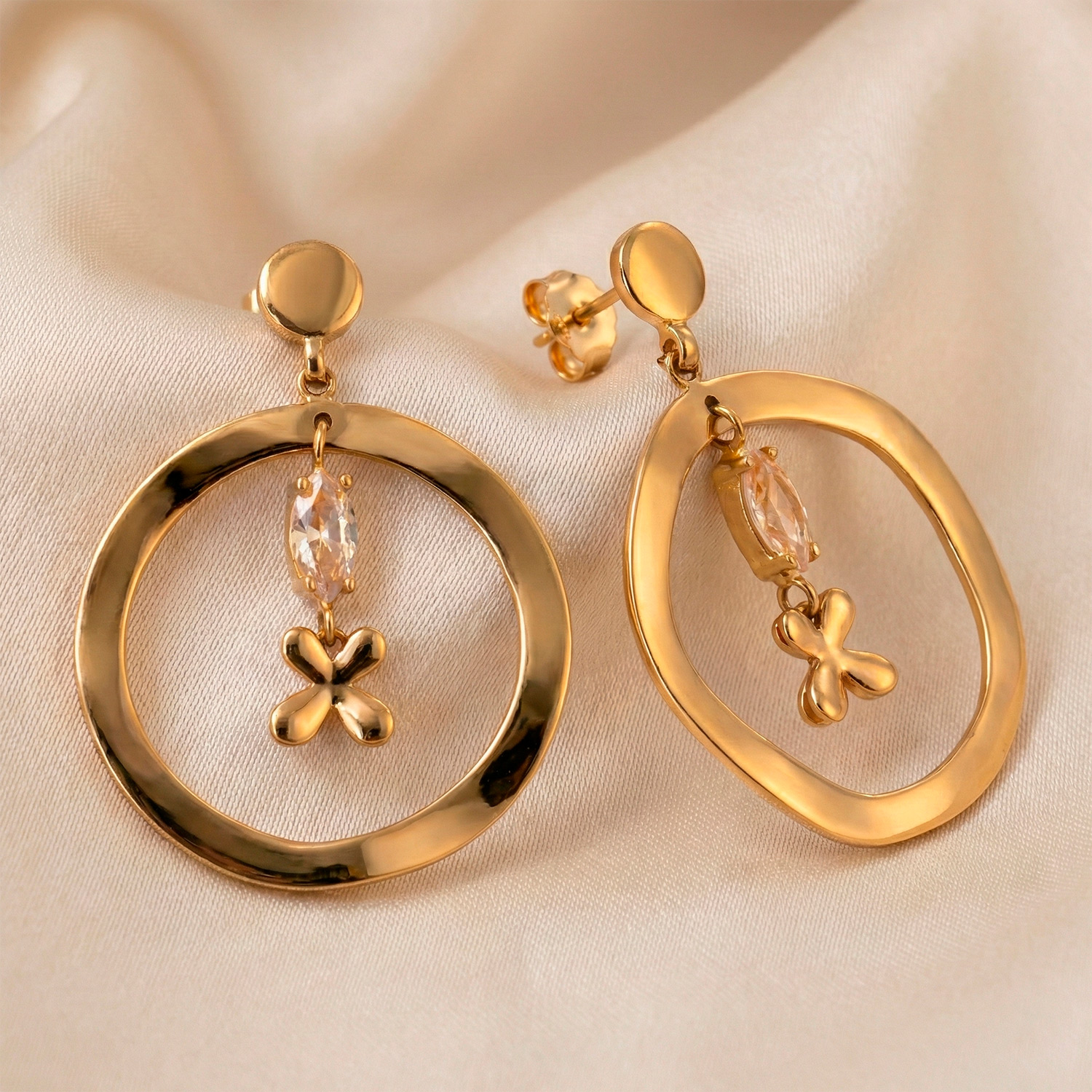 Aretes de aro irregular enchapados en oro con dije central de cristal y trébol. Un diseño vanguardista, ligero y lleno de brillo.