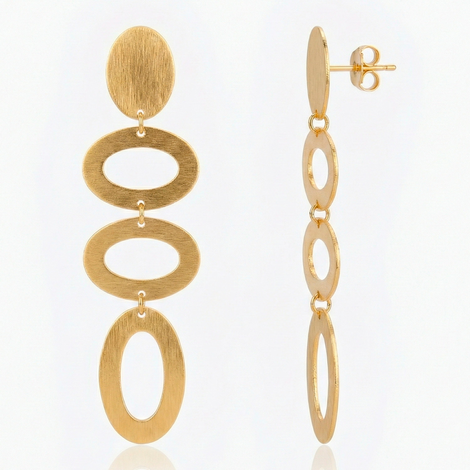 Aretes largos enchapados en oro con aros ovalados calados y enlazados. Un diseño vanguardista, ligero y sumamente elegante.