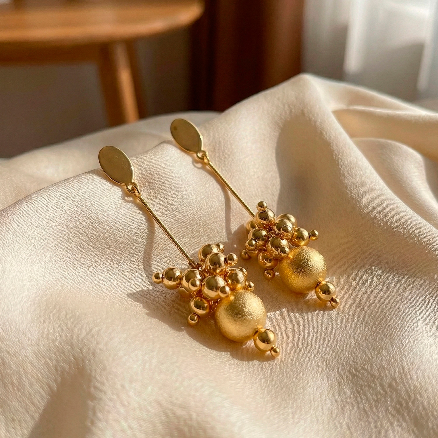 Aretes largos enchapados en oro con racimo de esferas brillantes y acabado satinado. Un diseño tridimensional, moderno y lleno de estilo.