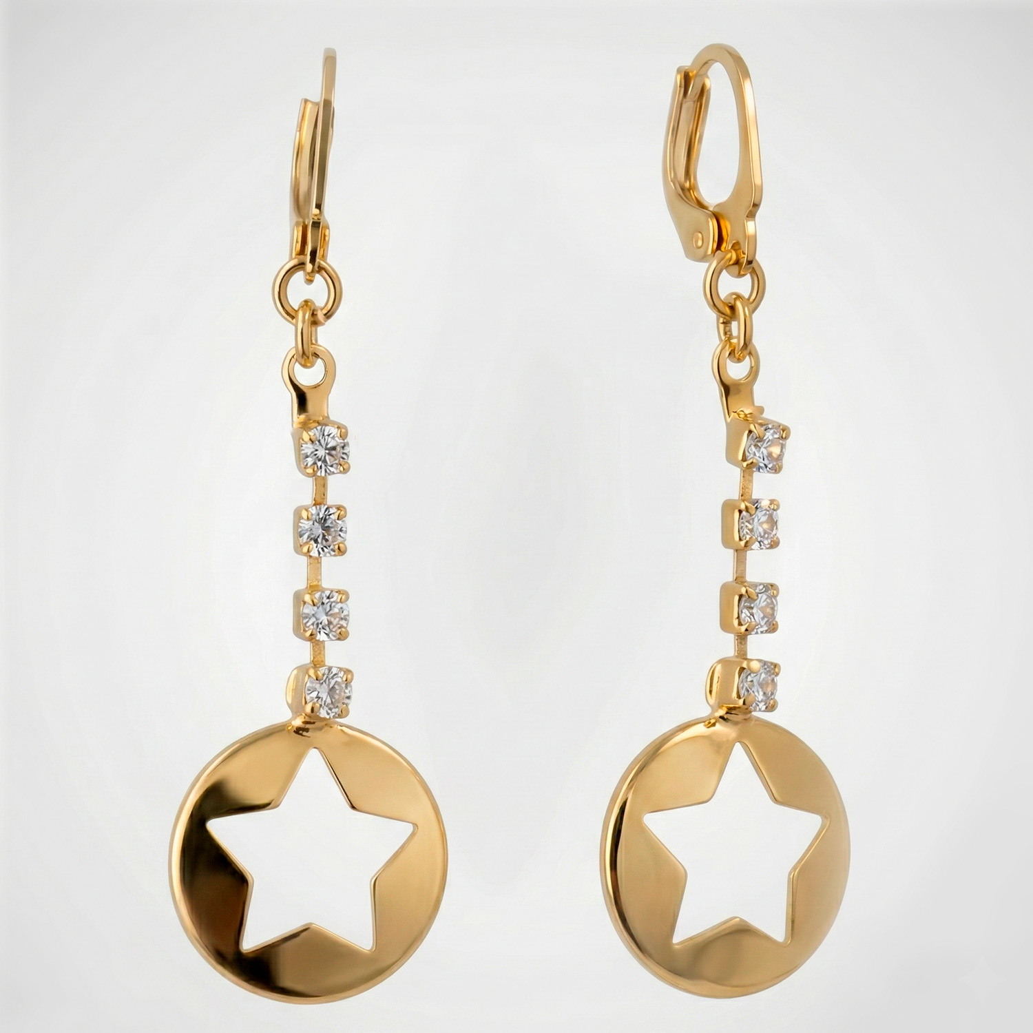 Aretes largos enchapados en oro con cierre de asa, cascada de cristales strass y dije de estrella calada. Una pieza ligera, moderna y llena de simbolismo.