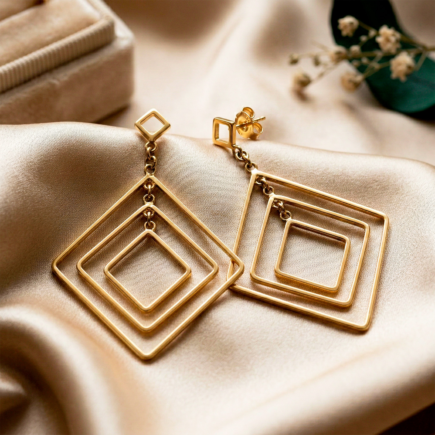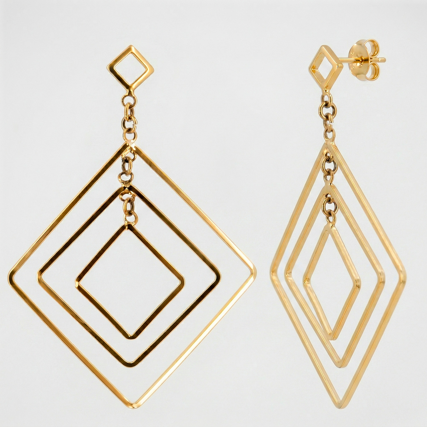 Aretes largos enchapados en oro con diseño de rombos triples concéntricos. Una joya vanguardista, ligera y de gran impacto visual.