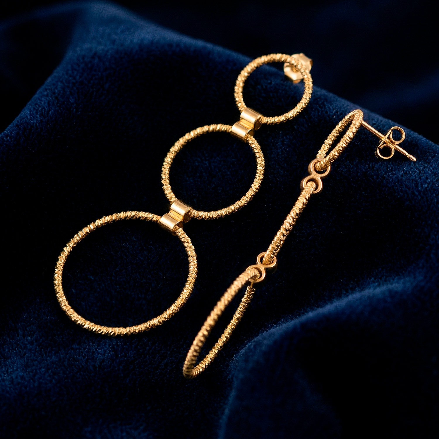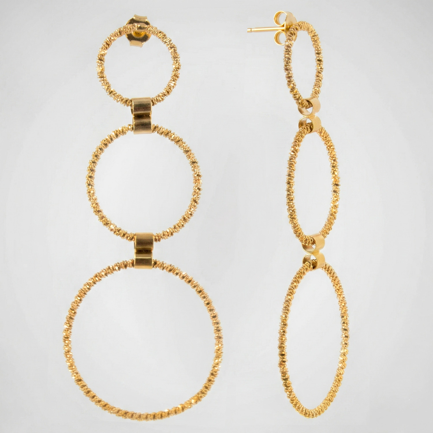 Aretes largos enchapados en oro con diseño de tres aros concéntricos texturizados. Una joya moderna, radiante y con un movimiento excepcional.