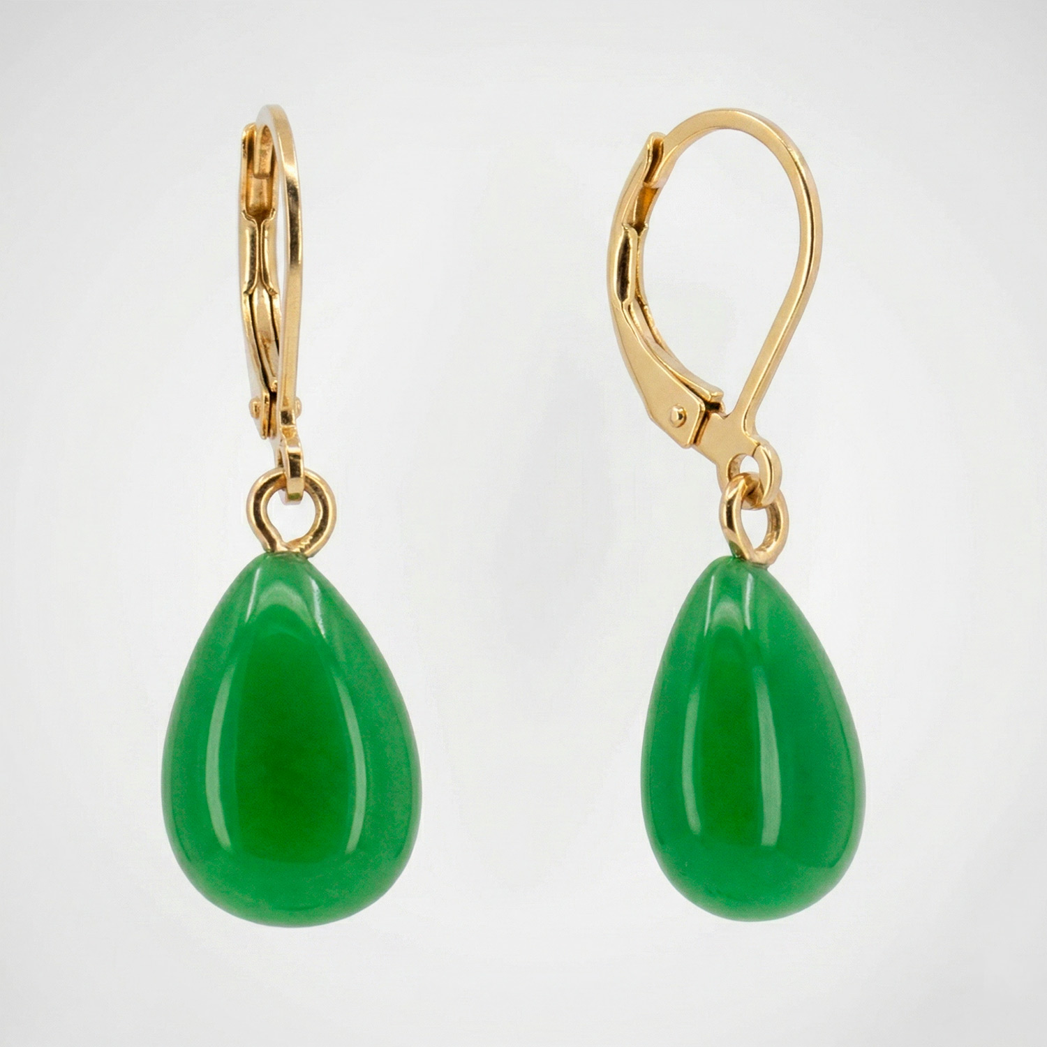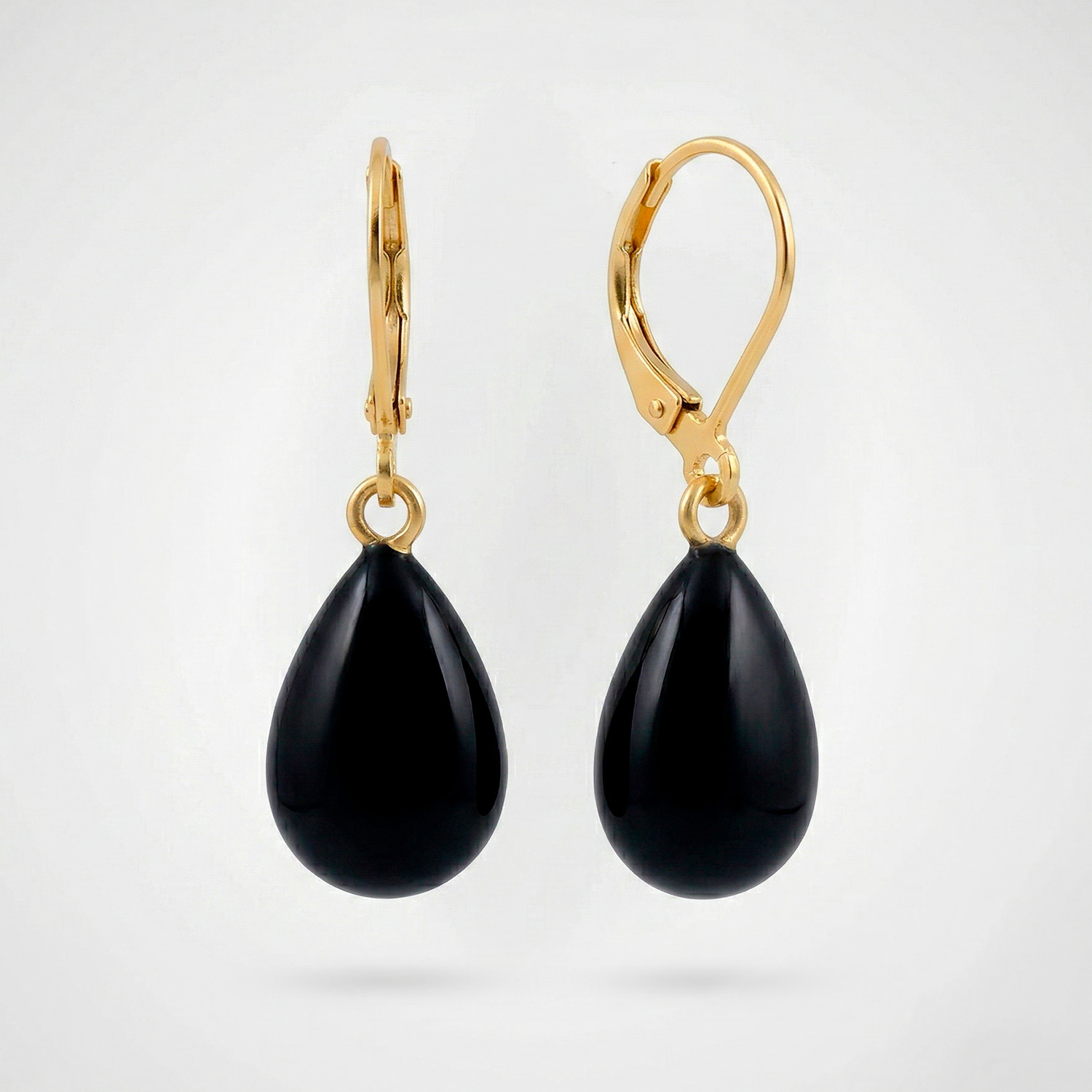 Aretes enchapados en oro con cierre de asa y dije de gota esmaltada. Una pieza atemporal y elegante, disponible en color negro profundo y verde claro.