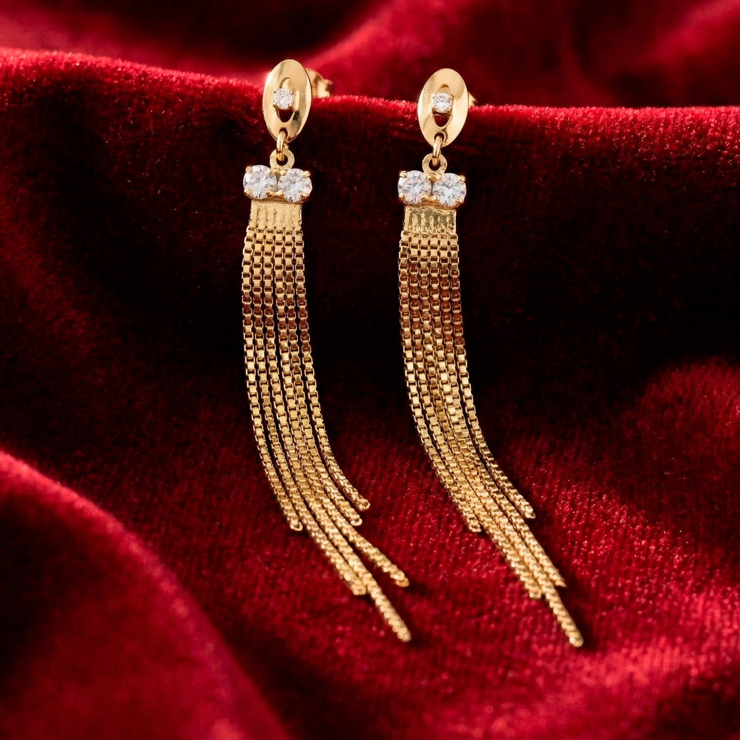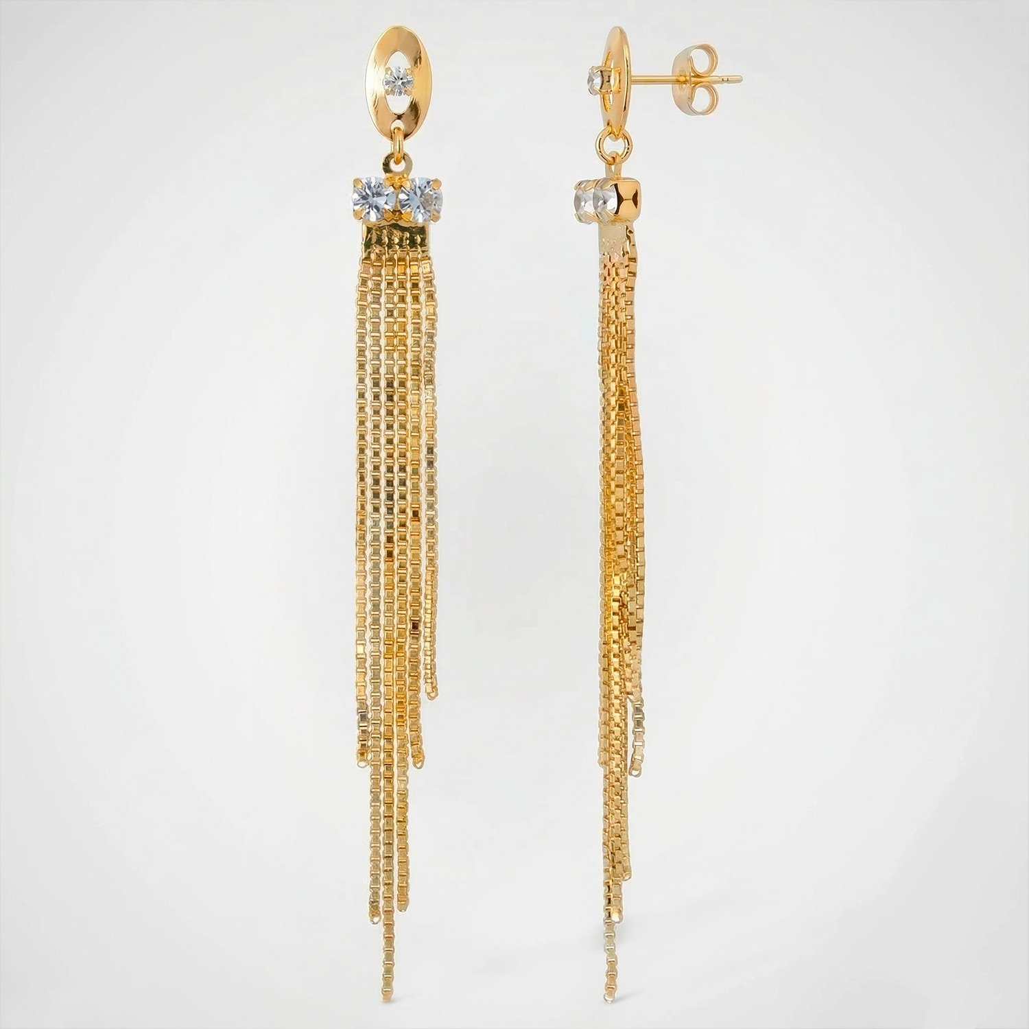 Aretes largos enchapados en oro con detalles de circonias y cascada de cadenas finas. Una joya de lujo con movimiento excepcional.