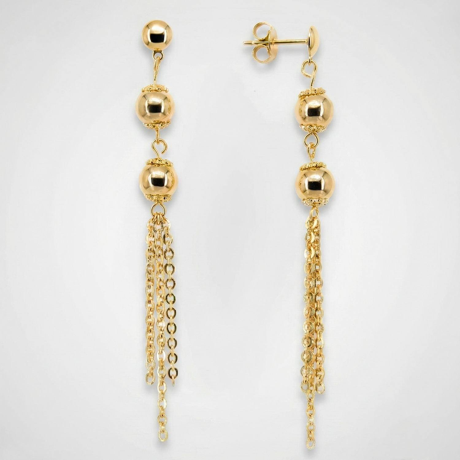 Aretes largos enchapados en oro con esferas pulidas y cascada de cadenas. Un diseño elegante, con gran movimiento y brillo.