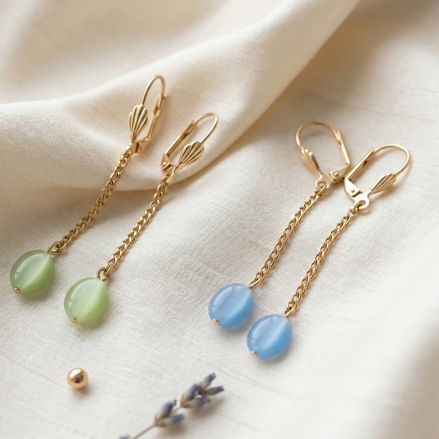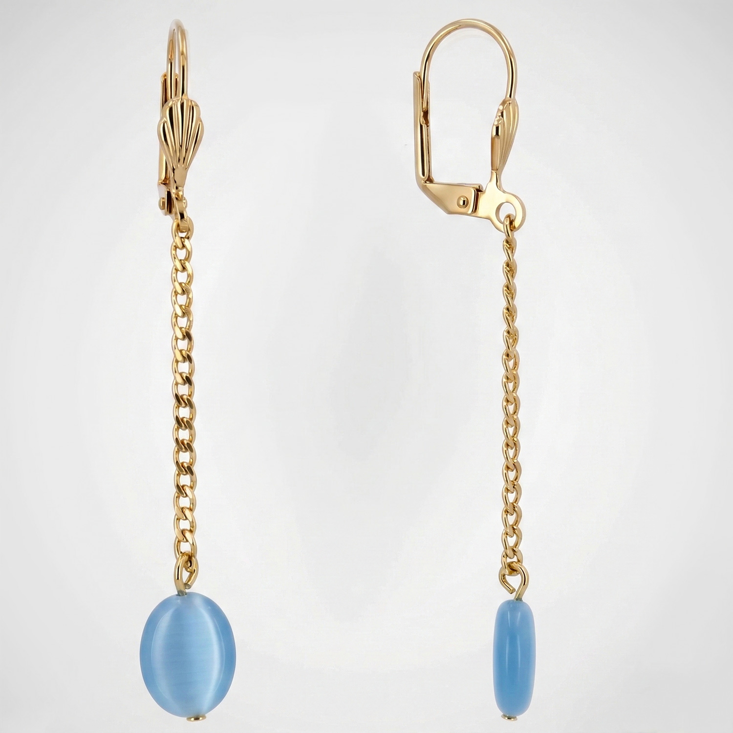 Aretes largos enchapados en oro con cierre de asa, caída de cadena y piedra ovalada en color celeste con efecto ojo de gato. Una joya refinada, minimalista y con un movimiento encantador.