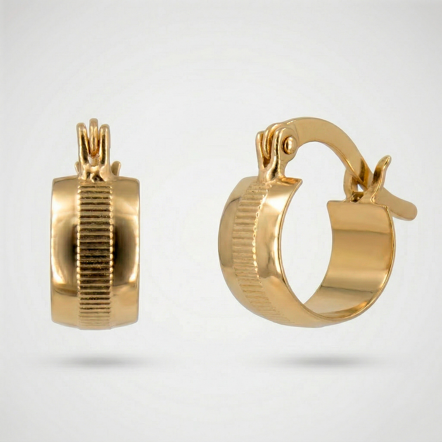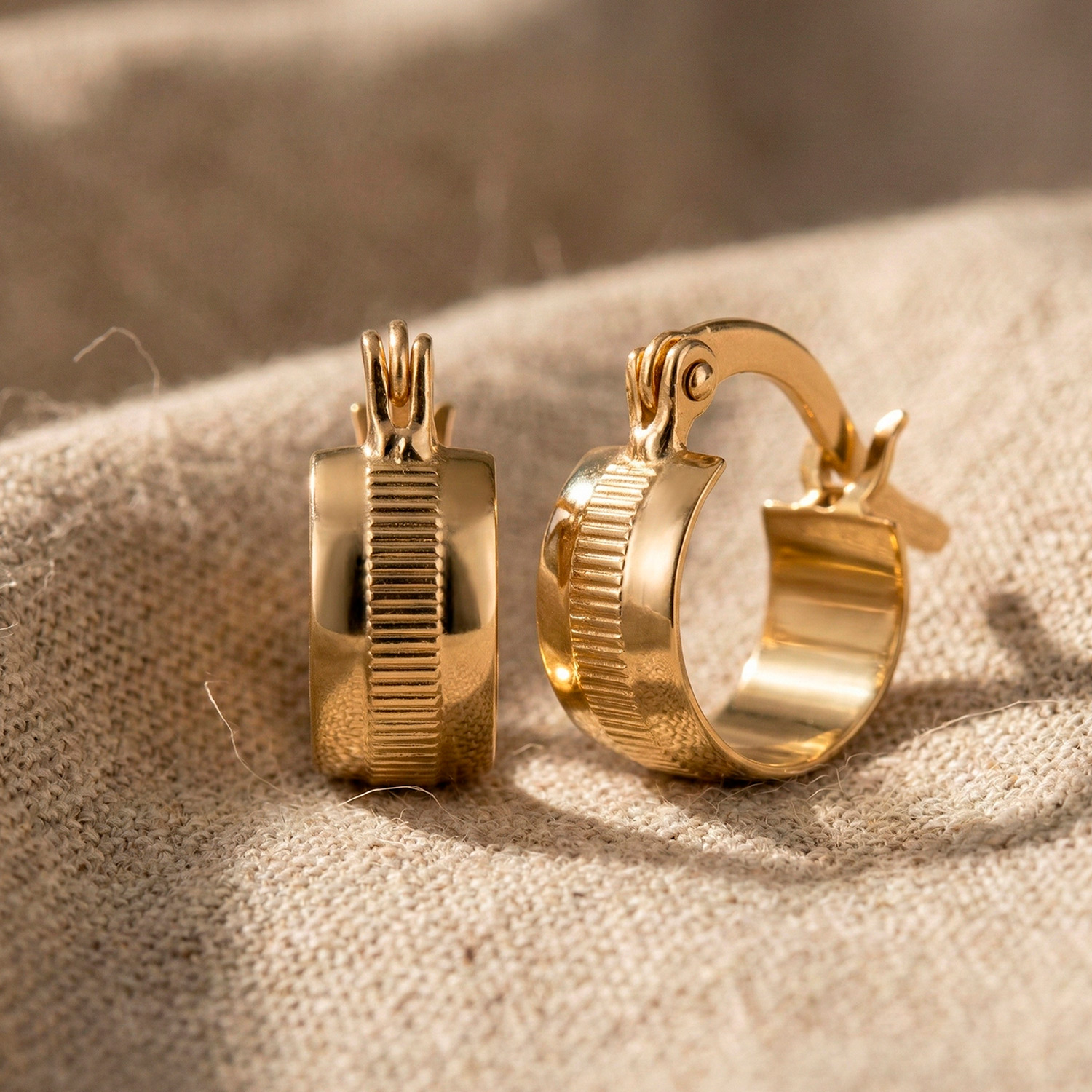 Argollas de banda ancha enchapadas en oro con detalle central acanalado y acabado pulido. Una pieza con diseño estructurado, cierre de asa y una estética contemporánea impecable.