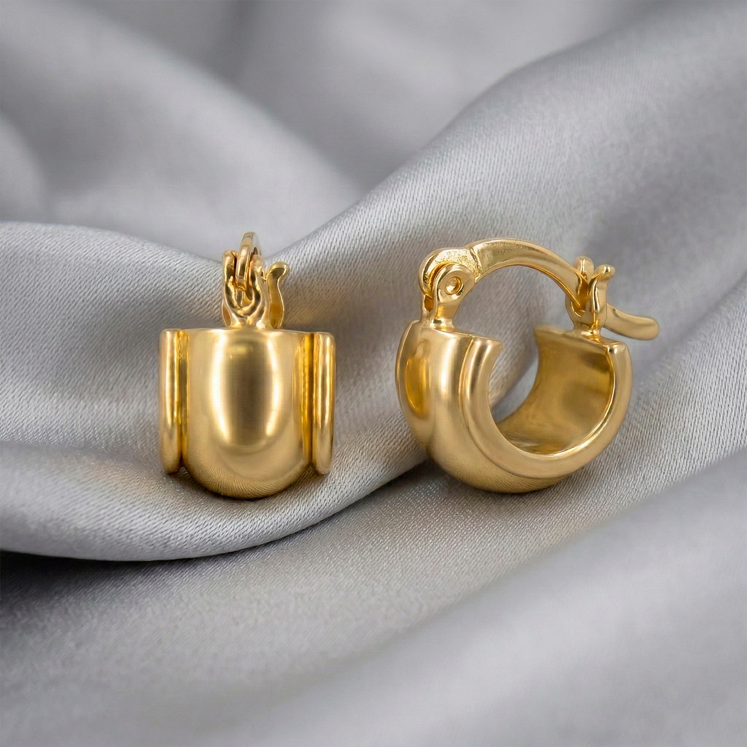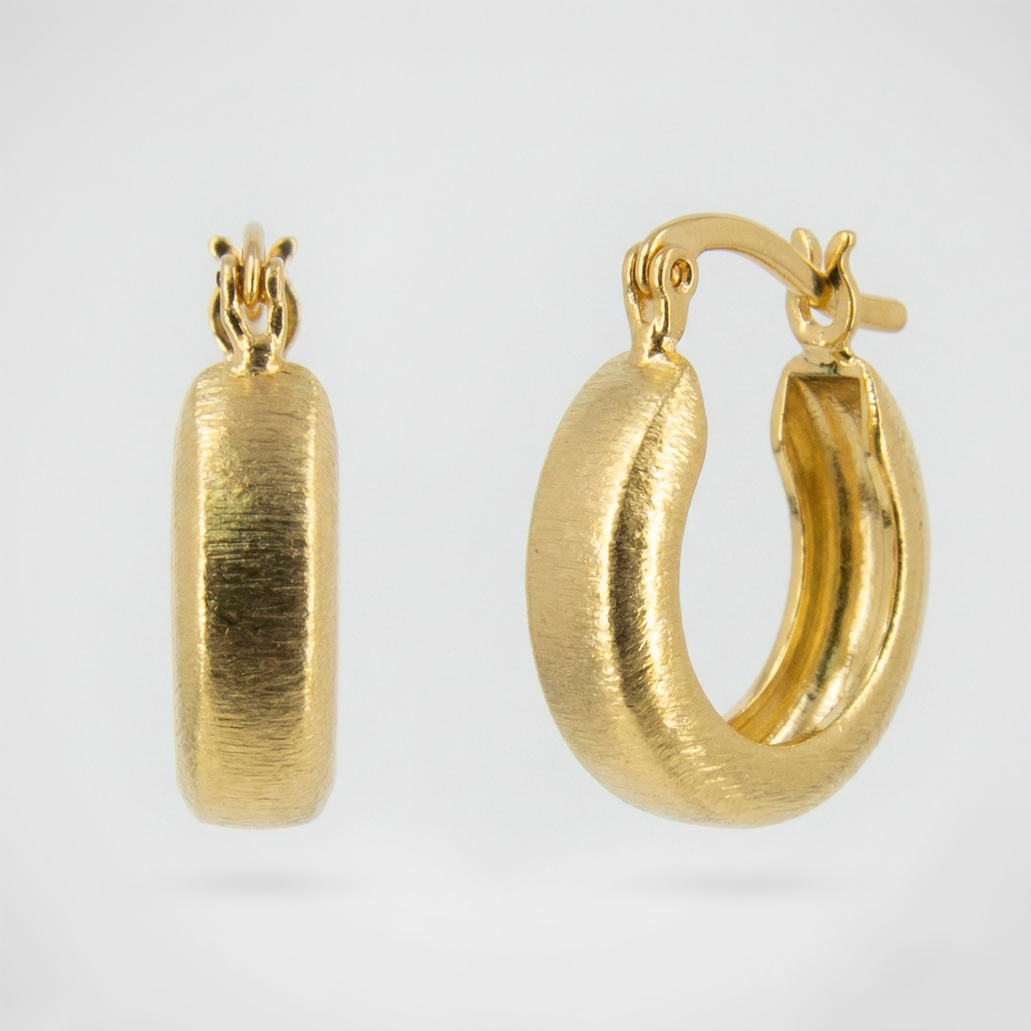 Argollas de banda ancha enchapadas en oro con acabado cepillado mate y textura satinada. Una joya contemporánea, minimalista y con un brillo suave y sofisticado.