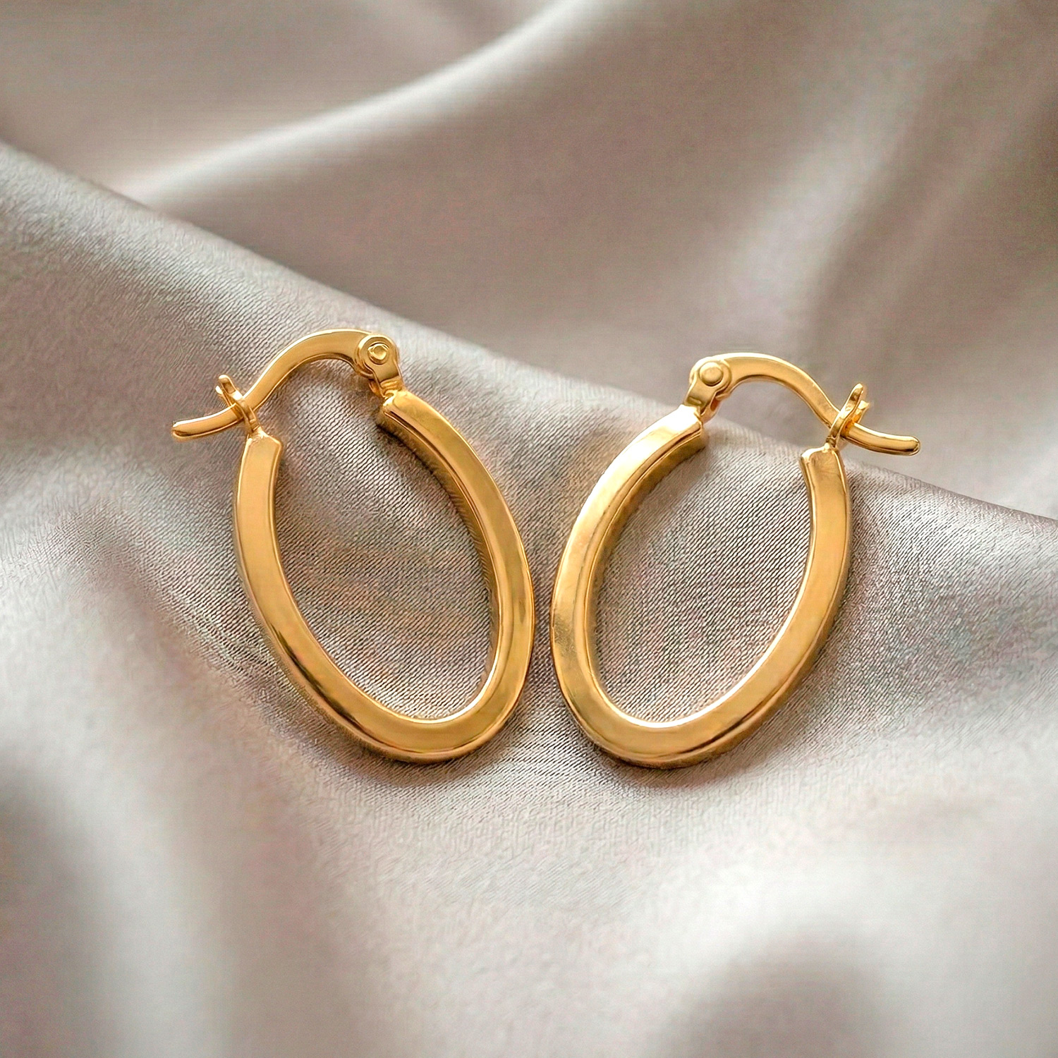 Argollas ovaladas enchapadas en oro con perfil plano y acabado pulido espejo. Una joya minimalista, sofisticada y con un diseño que estiliza el rostro de forma natural.