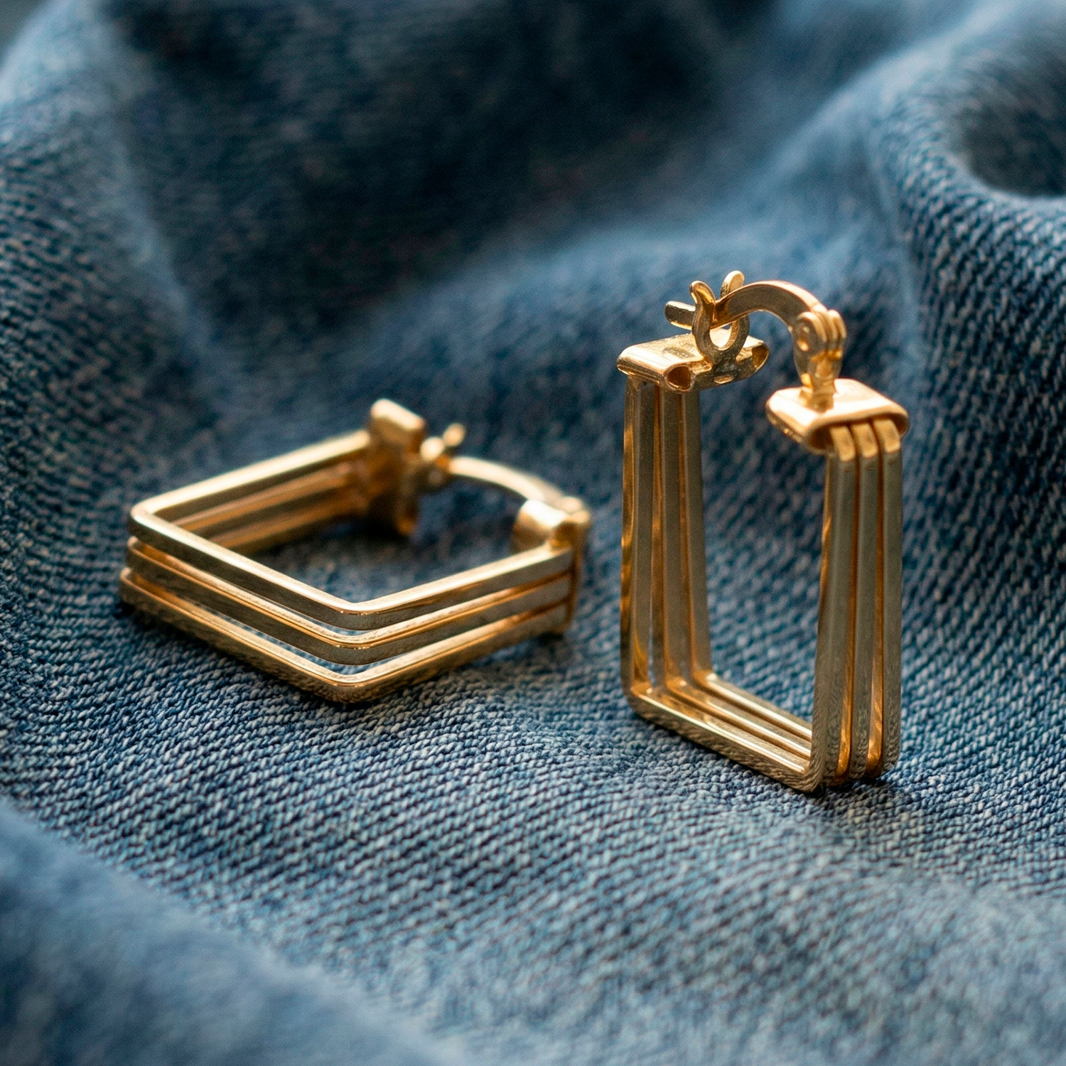 Argollas rectangulares enchapadas en oro con diseño de triple marco y acabado pulido espejo. Una joya de estética minimalista y contemporánea que aporta una estructura única a tu look.