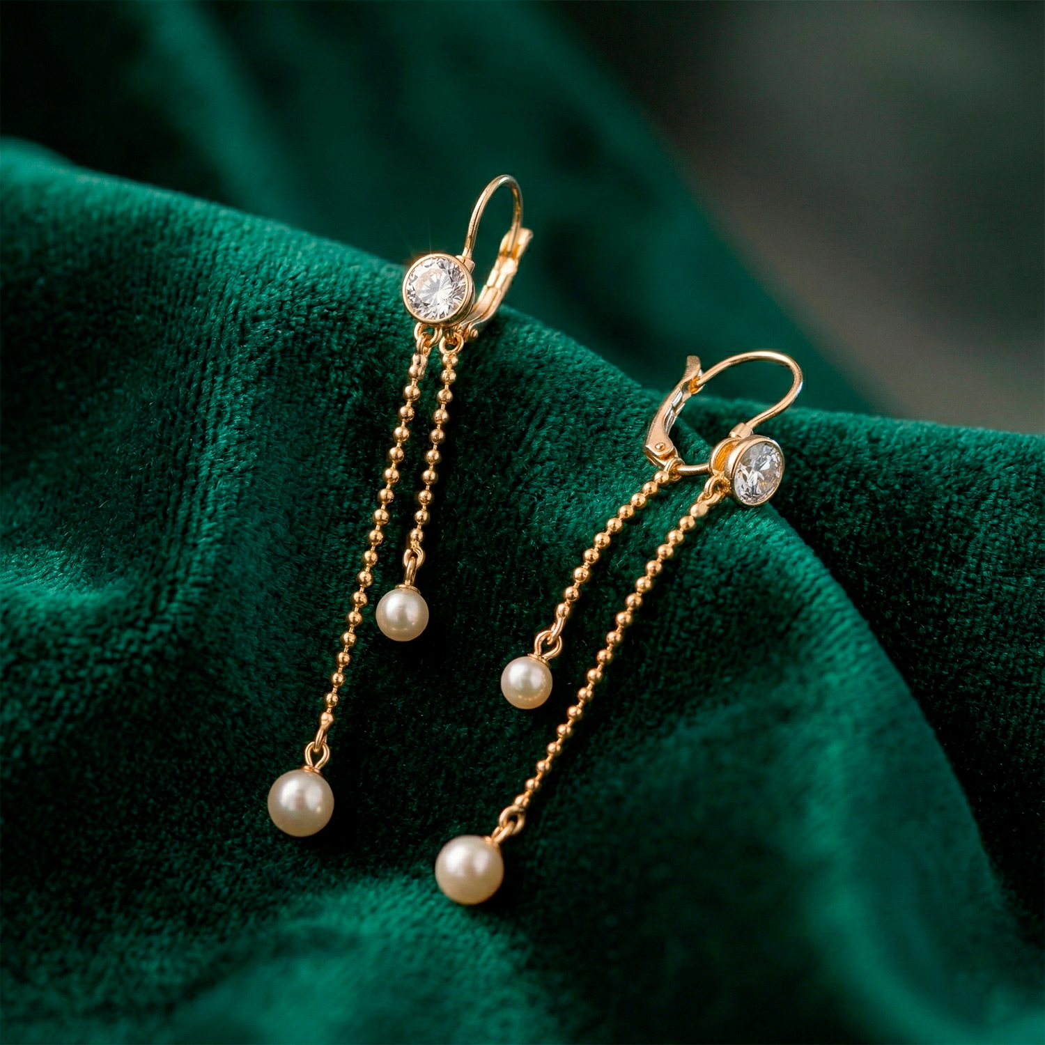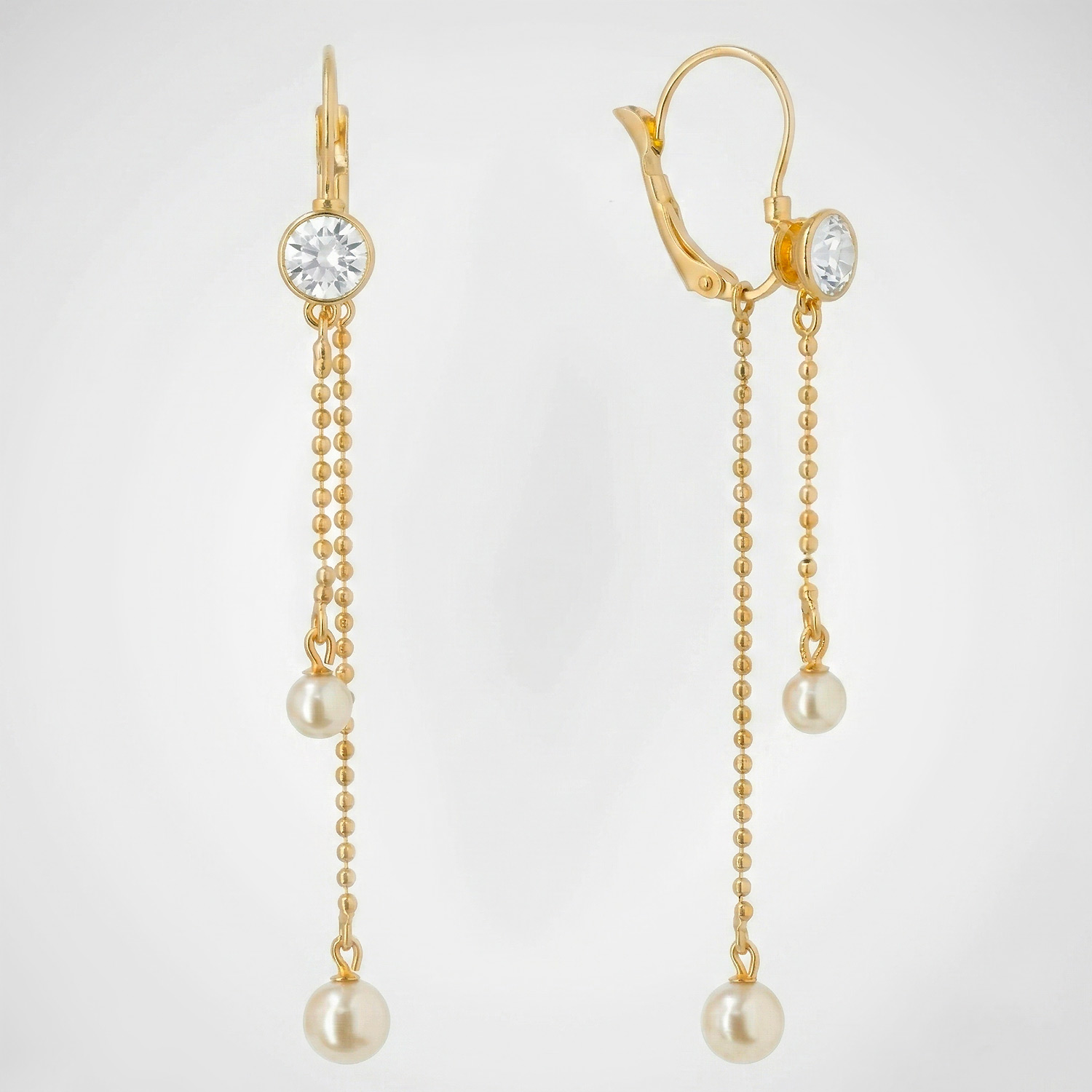 Aretes largos enchapados en oro con cristal superior, cadenas de esferas y perlas colgantes en desnivel. Una joya femenina, sofisticada y con un movimiento encantador.