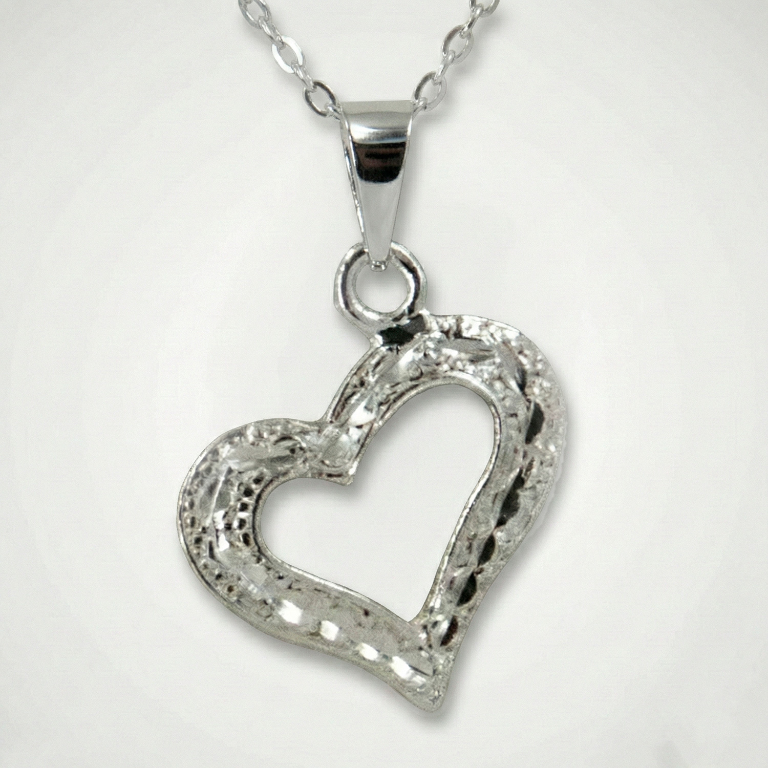 Dije de corazón abierto enchapado en plata con acabado texturizado. Un diseño clásico que ofrece un brillo especial y un estilo romántico atemporal.