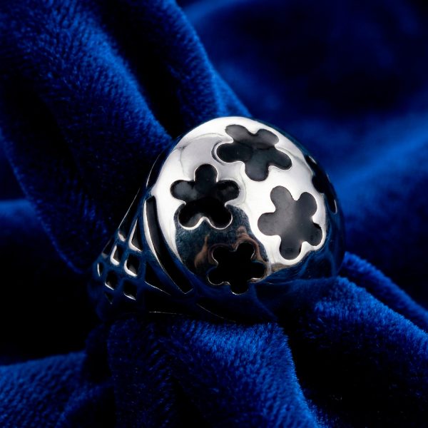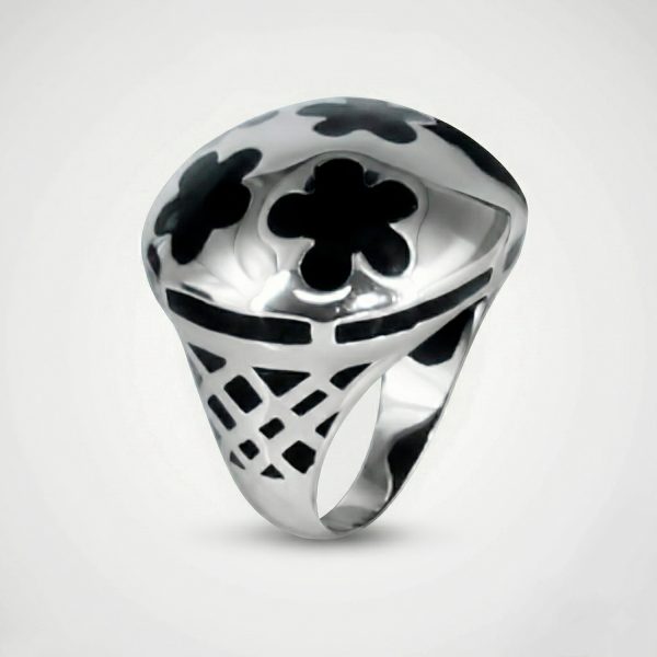 Anillo de acero tipo cúpula con flores negras en la parte superior y laterales con diseño de rejilla. Un contraste moderno y audaz.