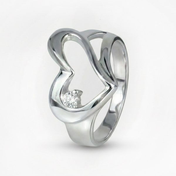 Celebra el amor moderno con este anillo bañado en plata 925. Su banda se curva artísticamente para formar un corazón abierto y estilizado que acuna un delicado circón brillante. Una joya de diseño fluido y romántico, ideal para lucir elegancia contemporánea con un significado especial.