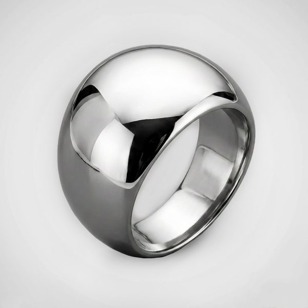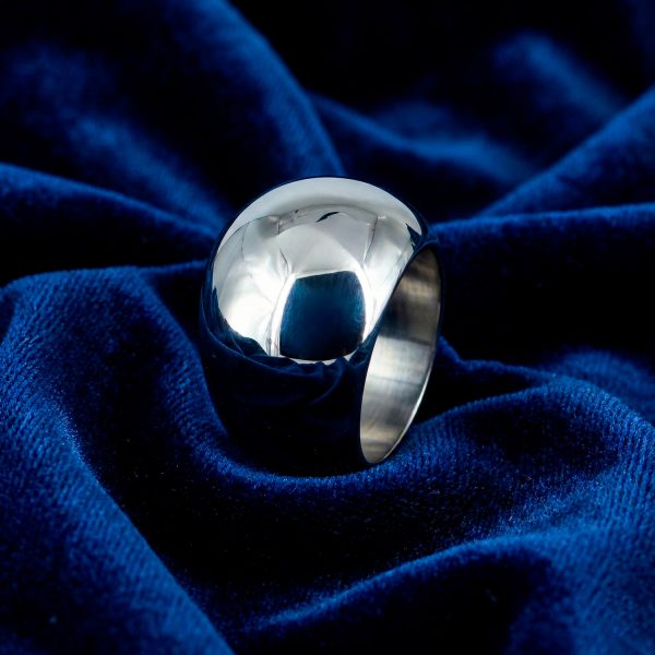 Anillo ancho de acero inoxidable con diseño abombado y acabado pulido espejo. Una pieza robusta, moderna y sofisticada.