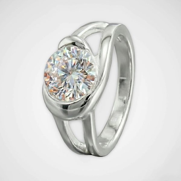 Deslumbra con un diseño de vanguardia que redefine el solitario clásico. Este anillo enchapado en plata destaca por su estructura orgánica y envolvente, con una banda ancha de líneas fluidas que se curvan para abrazar un imponente cristal central. La gema, de corte redondo brillante, está integrada en un engaste que sigue la sinuosidad de la pieza, permitiendo que el acabado pulido espejo del metal resalte la claridad y el destello de la piedra. Es el accesorio perfecto para quienes buscan una joya con volumen, elegancia y un marcado carácter arquitectónico.