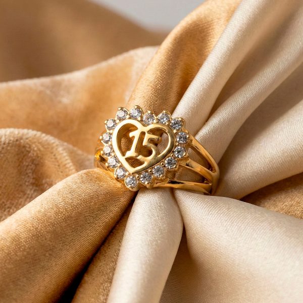 Anillo de acero dorado con corazón de cristales y el número 15 en el centro. El regalo ideal para una quinceañera.