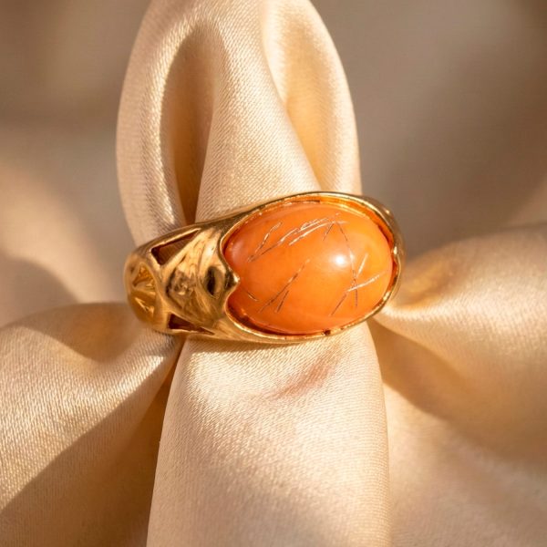 Anillo de banda ancha enchapado en oro con piedra ovalada color naranja y laterales calados. Un diseño audaz, cálido y lleno de luz.