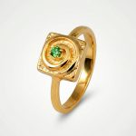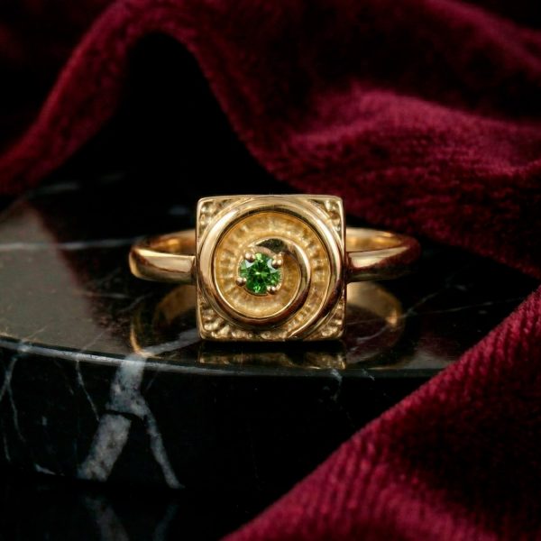 Anillo enchapado en oro con diseño de cara cuadrada, espiral en relieve y un cristal central verde esmeralda. Una joya moderna con un aire místico.