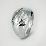 Gran anillo escultural de acero con forma fluida y alargada. Un diseño vanguardista de alto brillo y gran impacto.