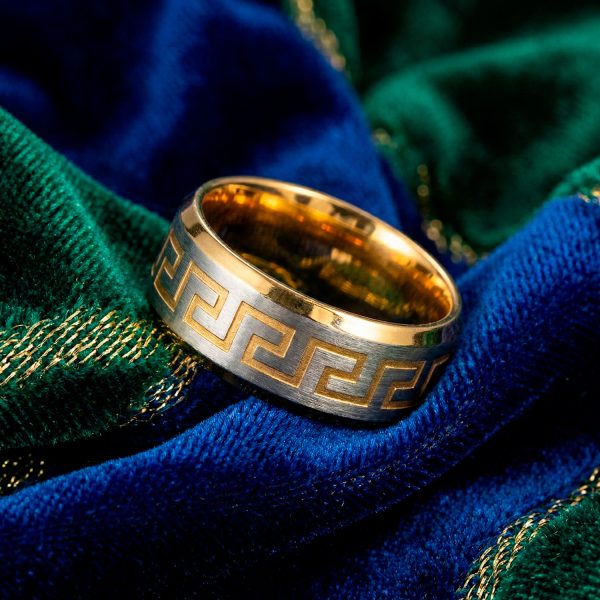 Lleva la historia y la elegancia en tu mano con este sofisticado anillo de acero inoxidable estilo banda. Su diseño bitono presenta una franja central en acero plateado con un moderno acabado cepillado (mate), donde se ha esculpido el icónico patrón de la “greca” o llave griega, símbolo del infinito y la unidad. El diseño se completa con bordes y un interior en tono dorado pulido brillante, creando un contraste de lujo entre texturas y colores que resalta el motivo geométrico.