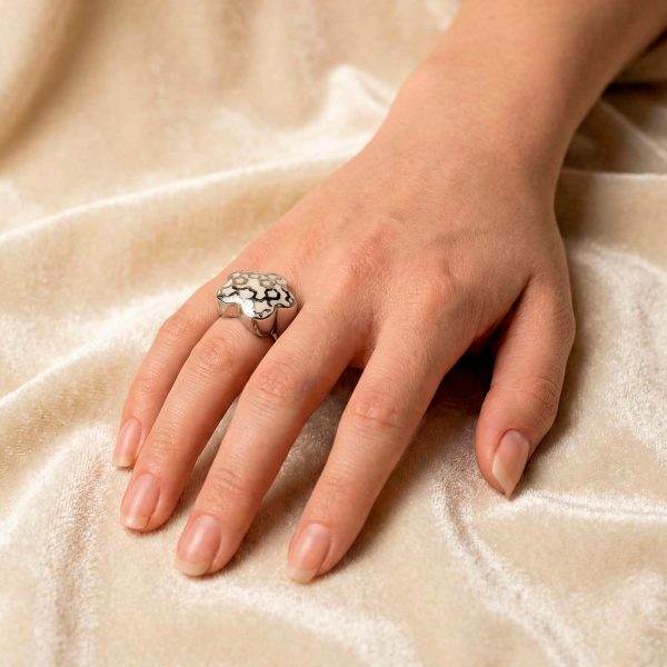 Anillo de acero con forma de flor, fondo de esmalte crema y patrón de estrellas. Un diseño dulce, juvenil y muy original.