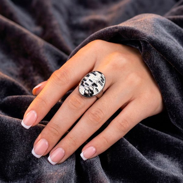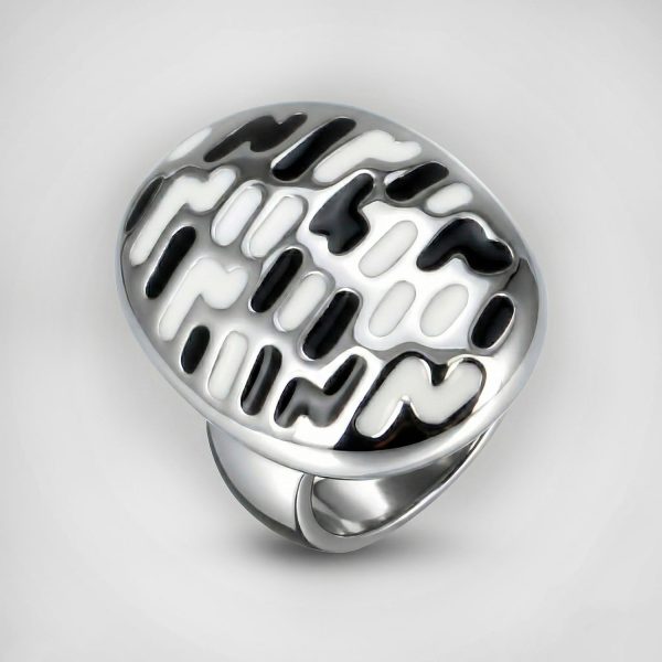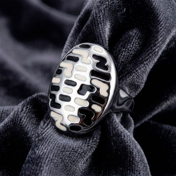 Anillo ovalado de acero con diseño abstracto en esmalte blanco y negro. Una pieza artística, moderna y de gran impacto visual.