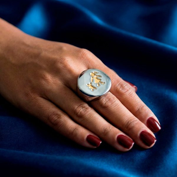 Anillo de acero bitono con siluetas doradas de niña y niño. Un diseño tierno y moderno que celebra la familia.