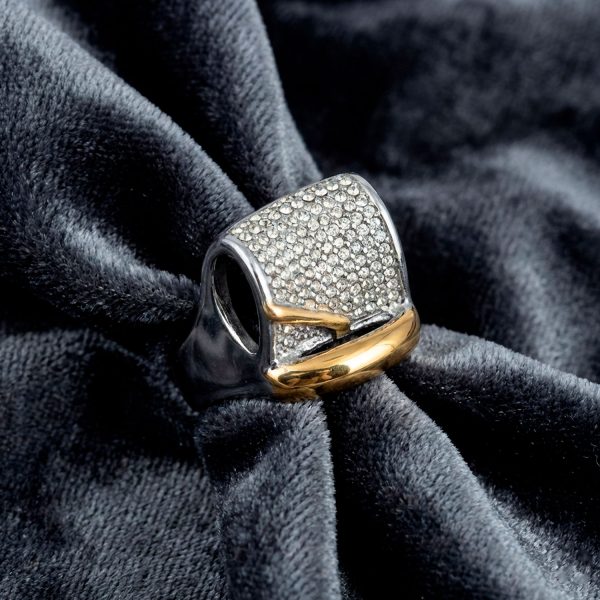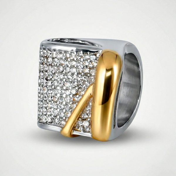 Anillo ancho de acero bitono con superficie en pavé de cristales y acento dorado curvo. Un diseño lujoso y moderno para destacar.
