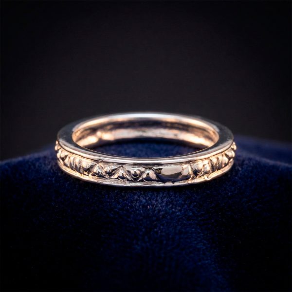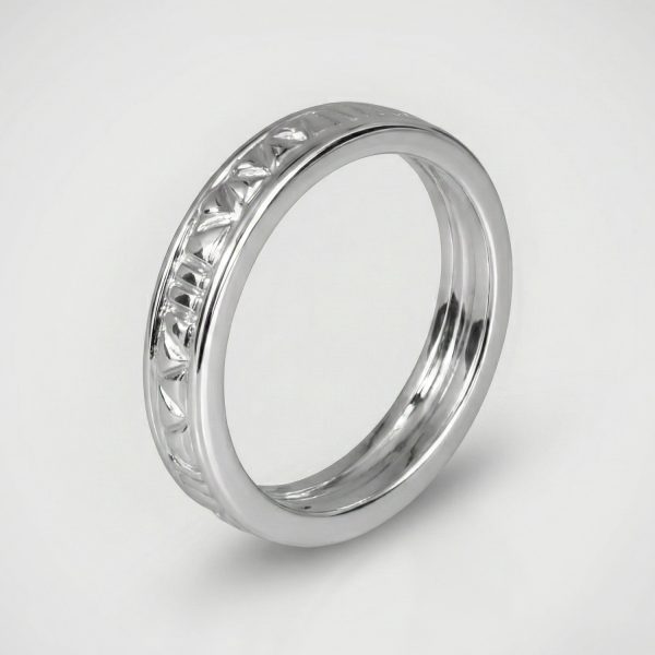 Este refinado anillo enchapado en plata destaca por su diseño de banda continua que combina la sobriedad con el detalle artesanal. La pieza presenta una circunferencia de bordes redondeados y pulidos, cuyo centro está decorado con un intrincado patrón de grabados geométricos en relieve. Este labrado crea un juego de luces y sombras que resalta la calidad del acabado plateado, convirtiéndolo en un accesorio versátil e ideal tanto para el uso diario como para complementar un estilo más formal.