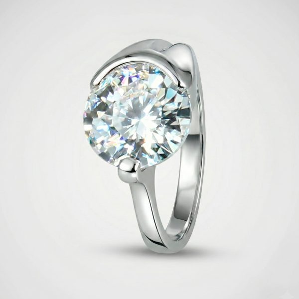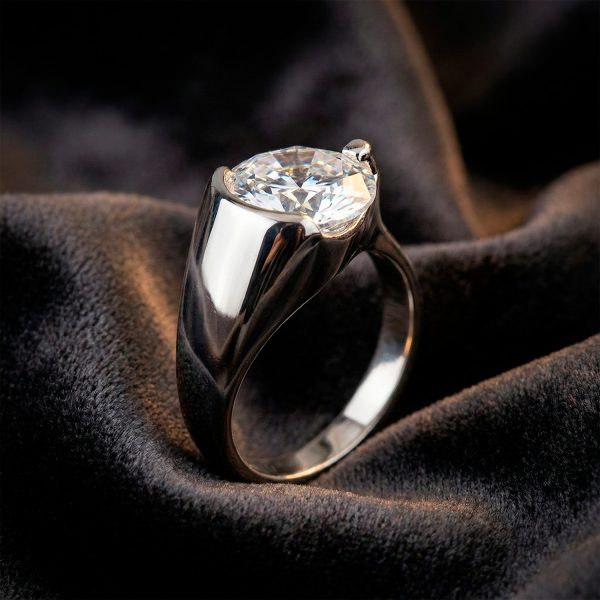 Este impresionante anillo enchapado en plata destaca por su diseño escultural y su estética vanguardista. La estructura presenta una banda ancha que fluye orgánicamente hacia un engaste elevado de líneas limpias y aerodinámicas. Coronando la pieza, una imponente circonia de corte brillante se sitúa en una posición prominente, permitiendo que su excepcional faceteado capture y proyecte la luz con una intensidad deslumbrante sobre el acabado pulido espejo del metal.