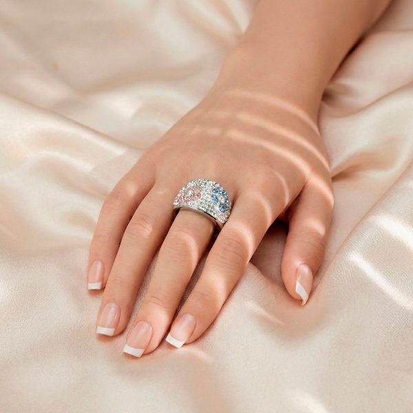 Siente el máximo resplandor con este espectacular anillo de banda ancha fabricado en acero inoxidable. Su diseño de cúpula está completamente recubierto por un densificado de cristales blancos que crean una base de brillo ininterrumpido. La pieza cobra vida con dos flores estilizadas: una en cristales azul turquesa y otra en cristales rosa suave, cada una con un centro de cristal transparente que aporta un contraste alegre y femenino. Es una joya de gran presencia, ideal para quienes buscan un accesorio que combine la durabilidad del acero con un estilo tipo “pavé” de alta joyería.