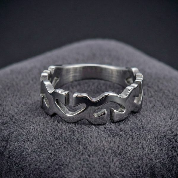 Este anillo de acero inoxidable destaca por su banda calada con un patrón geométrico de estilo tribal o de llamas estilizadas. Su acabado cepillado mate le otorga una apariencia robusta y contemporánea, ideal para quienes buscan un accesorio con carácter y una silueta dinámica que rompe con lo tradicional.