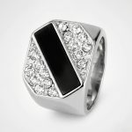 Anillo de sello hexagonal en acero inoxidable con piedra central color ónix y laterales con incrustaciones de cristales. Un diseño audaz, masculino y de gran lujo visual.