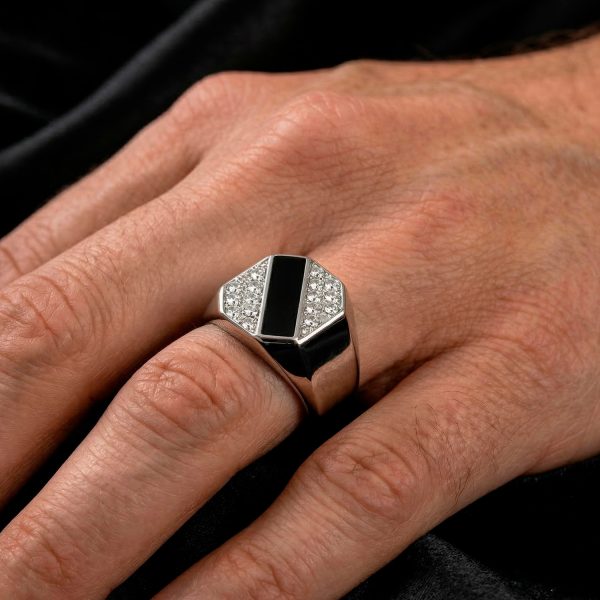 Anillo de sello hexagonal en acero inoxidable con piedra central color ónix y laterales con incrustaciones de cristales. Un diseño audaz, masculino y de gran lujo visual.