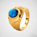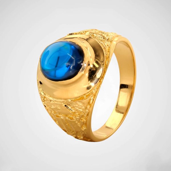 Anillo enchapado en oro de 18K con piedra azul tipo cabujón y detalles ornamentales laterales. Estilo clásico con esencia real.