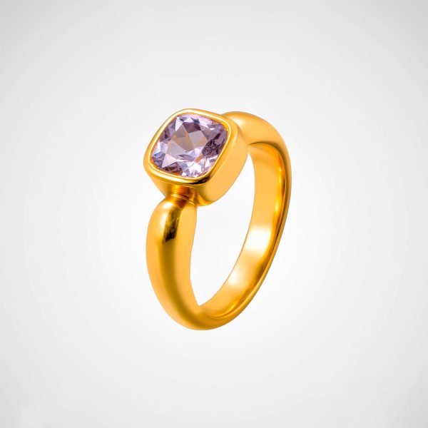 Anillo enchapado en oro de 18k con piedra central corte cushion. Una pieza moderna y elegante que resalta por su simplicidad brillante.