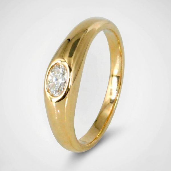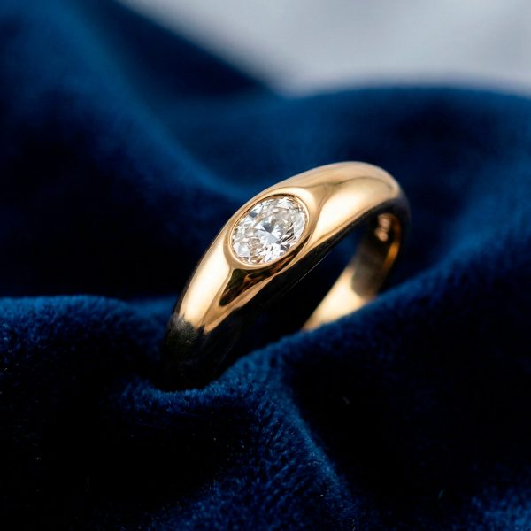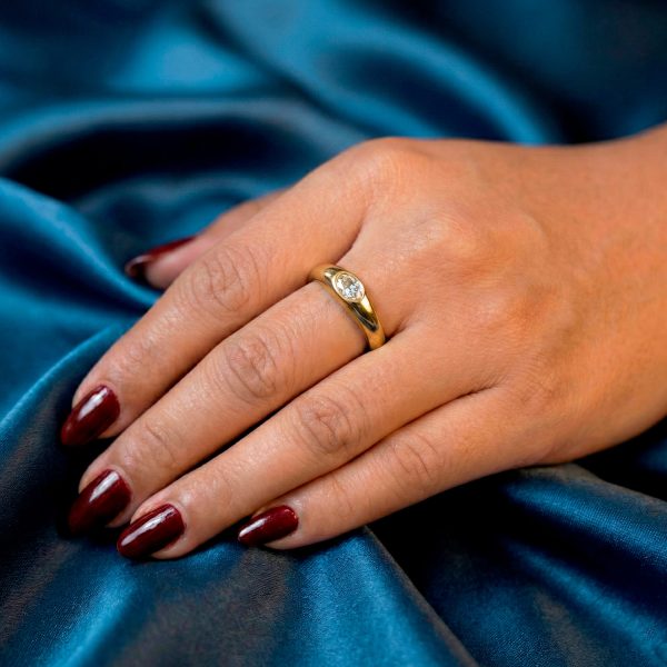 Añade un toque de luz discreto y sofisticado con este anillo enchapado en oro de diseño contemporáneo. Su banda se ensancha suavemente hacia el centro, creando una silueta orgánica que alberga un circón redondo de gran claridad, integrado perfectamente en un engaste liso que protege la gema y resalta su brillo natural.