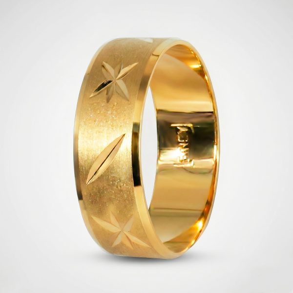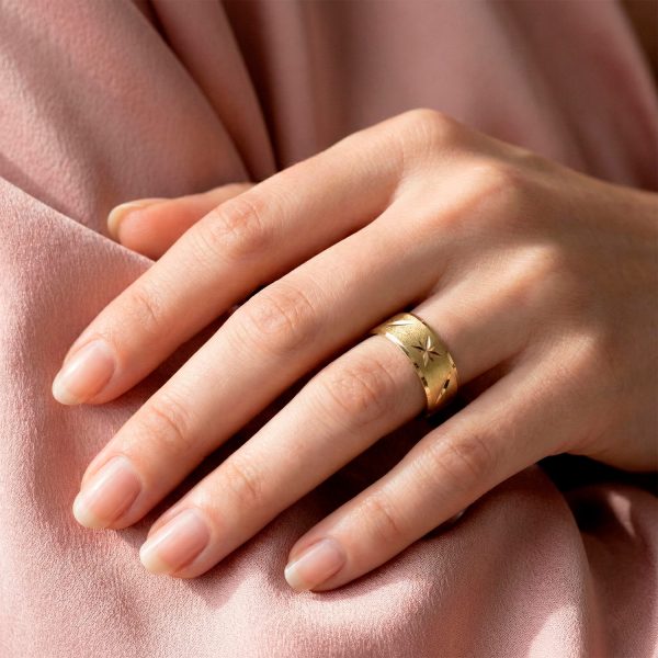 Eleva el concepto de la alianza clásica con este anillo enchapado en oro de diseño excepcional. Su banda ancha destaca por un sofisticado acabado satinado que contrasta con bordes biselados de alto brillo. El centro está decorado con grabados profundos en forma de estrellas y delicadas hojas, creando una textura artística que captura la luz con un resplandor celestial y atemporal.