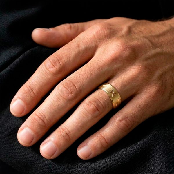 Alianza enchapada en oro con acabado satinado y grabados de estrellas. Un diseño artesanal, robusto y lleno de simbolismo.