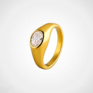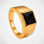 Un anillo robusto y elegante, elaborado en aleación hipoalergénica con baño de oro de 18k. Destaca una piedra ónix negra de corte cuadrado, montada sobre una banda de líneas sólidas y superficie pulida.