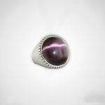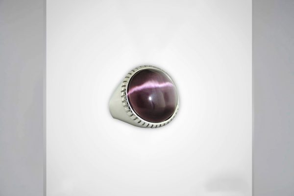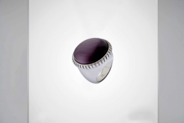 Anillo de acero inoxidable con piedra violeta efecto “ojo de gato” y marco dentado. Un diseño con mística, carácter y estilo único.