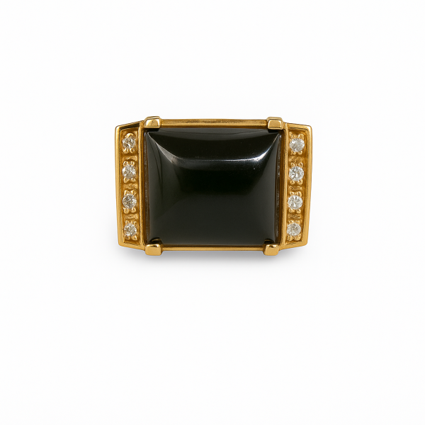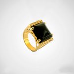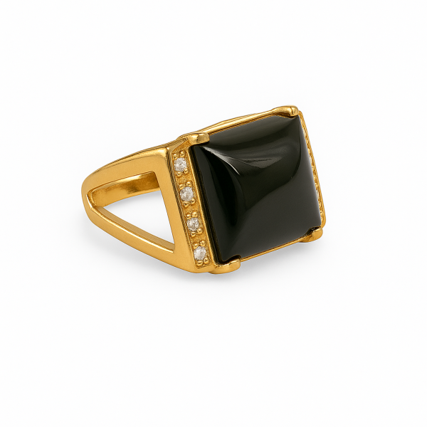 Anillo enchapado en oro con piedra ónix central cuadrada y detalles brillantes. Un diseño elegante y poderoso para destacar en toda ocasión.
