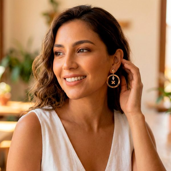 Eleva tu estilo con estos modernos aretes enchapados en oro que destacan por su diseño geométrico y fluido. La pieza presenta un aro principal de contorno irregular y acabado pulido, dentro del cual suspende un delicado dije móvil. Este detalle central combina un brillante cristal de corte marquise con un elegante motivo en forma de trébol o cruz de bordes redondeados, creando un juego de luces y movimiento que aporta una luminosidad única al rostro.