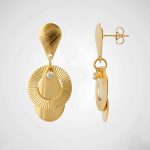 Desde esta gema cuelga un anillo circular adornado con doce cristales blancos de alto brillo, emulando un halo celestial o un disco solar, símbolo de totalidad y perfección. A su vez, tres colgantes trapezoidales móviles decorados con cristales incrustados aportan dinamismo visual, juego de reflejos y un sutil movimiento que ilumina el rostro con cada gesto.