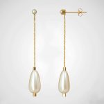 Desde esta gema cuelga un anillo circular adornado con doce cristales blancos de alto brillo, emulando un halo celestial o un disco solar, símbolo de totalidad y perfección. A su vez, tres colgantes trapezoidales móviles decorados con cristales incrustados aportan dinamismo visual, juego de reflejos y un sutil movimiento que ilumina el rostro con cada gesto.